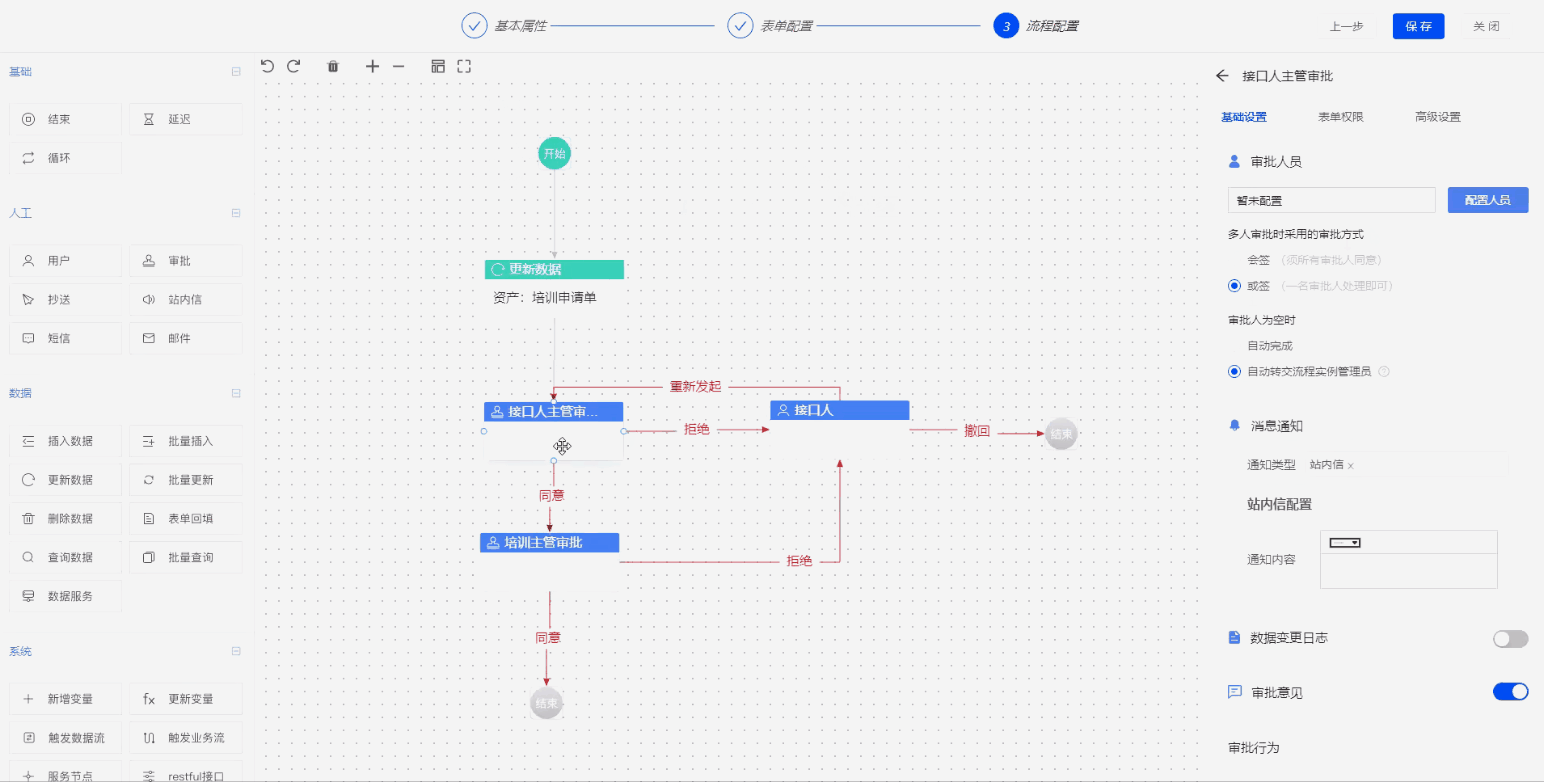 首先创建每个用户的审批权限,比如A用户只能有提交权限、B用户有审批和提交的权限。然后进行表单绑定,将做好的填报设计导入进来,目的是当流程传到每个节点时,每个用户会看到不同的申请信息。最后通过拖拽的方式创建审批流程图,实现整个培训申请的业务流程。