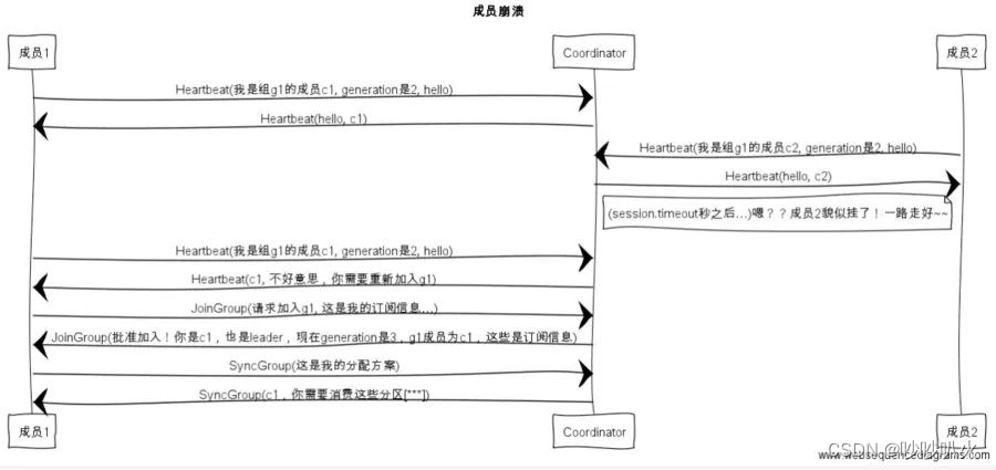 组成员崩溃和组成员主动离开是两个不同的场景。因为在崩溃时成员并不会主动的告知coordinator,coordinator有可能需要一个完整的session.timeout周期(心跳周期)才能检测到这种崩溃,这必然会造成consumer的滞后。主动离开是主动发起rebalance,而崩溃是被动发起rebalance。