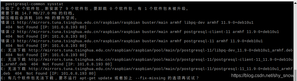 如果提示"有几个软件包无法下载,要不运行 apt-get update 或者加上 --fix-missing 的选项再试试?"