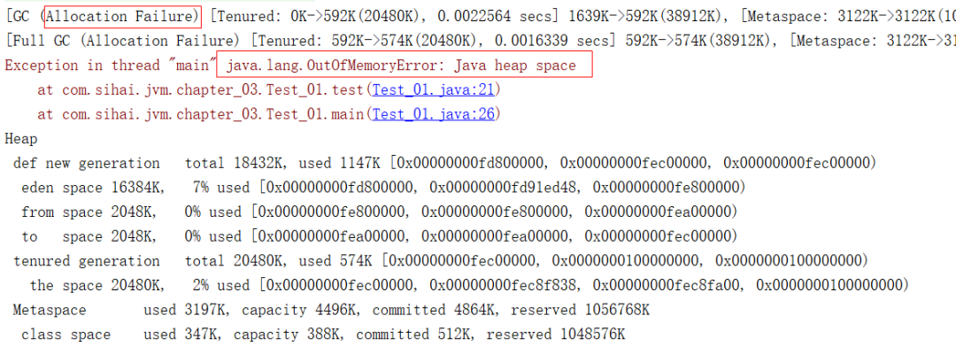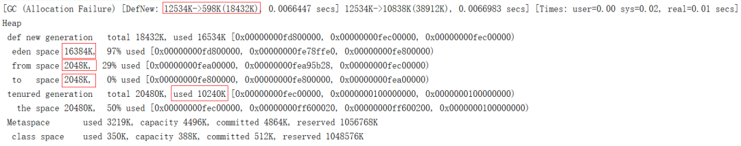 byte数组可以分配,但是,分配第四个的时候,空间不够,所以,需要进行一次Minor GC,GC之后,新生代从12534K变为598K。 -
