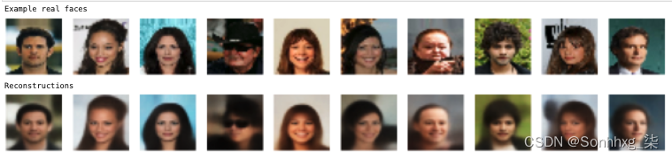 首先,让我们看一下重建面部的样本。图2.19 中的顶行显示原始图像,底行显示通过编码器和解码器后的重建图像。
