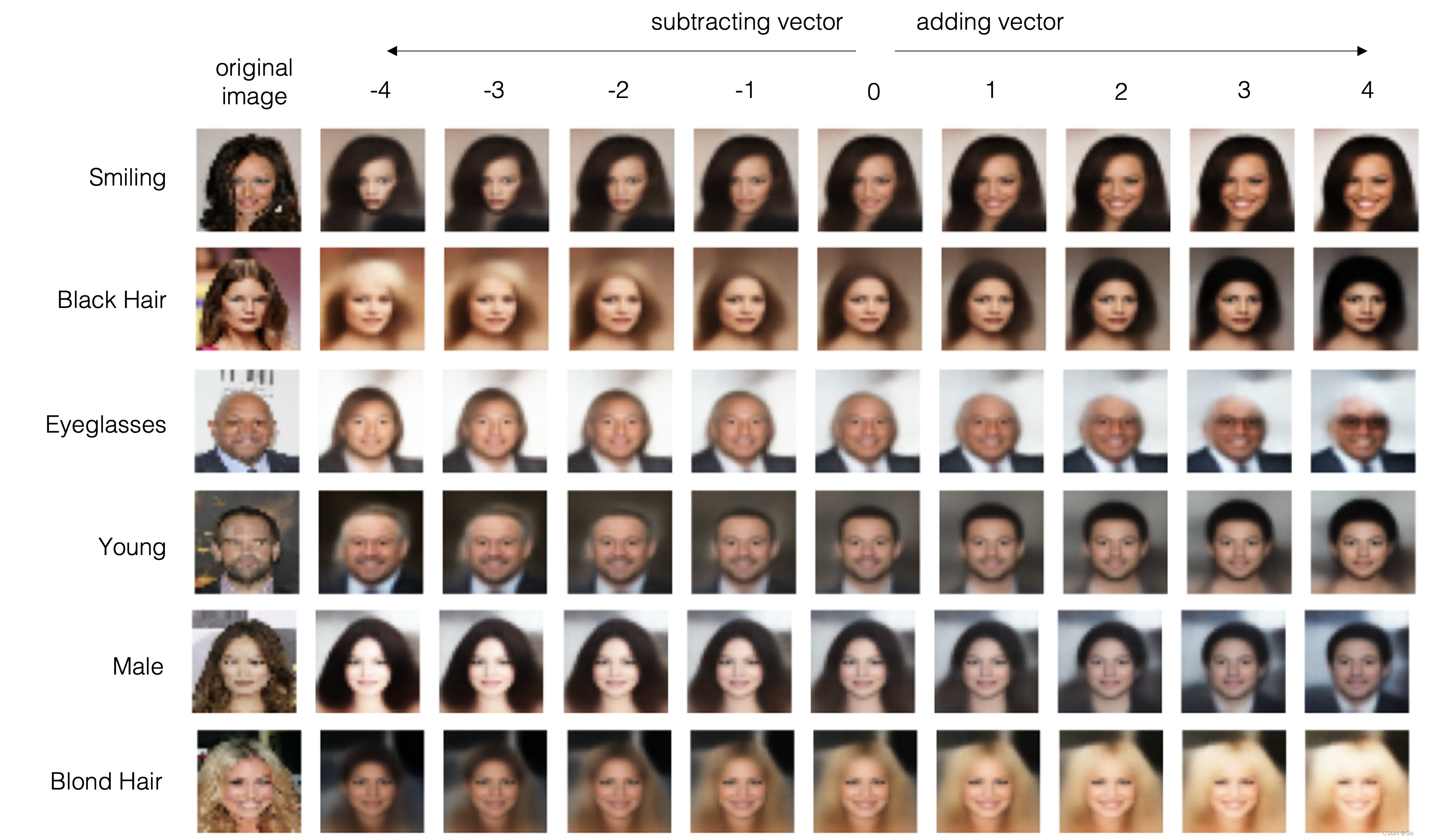 让我们看看实际效果。图2.22 显示了几个已编码到潜在空间中的图像。然后,我们添加或减去某个向量的倍数(例如,Smiling, Black_Hair, Eyeglasses, Young, Male, Blond_Hair)以获得图像的不同版本,仅更改相关特征。