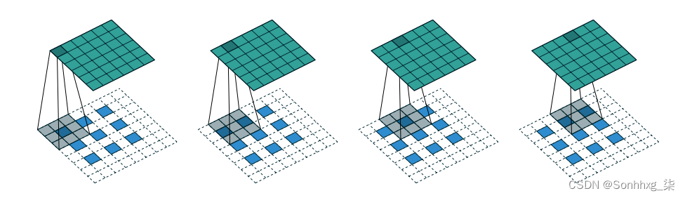 在卷积转置层中,该strides参数确定图像中像素之间的内部零填充,如图2.7 所示。