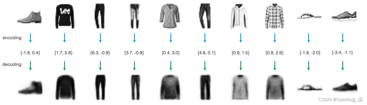 在图2.2 中,您可以看到其他原始服装项目(顶行)、编码后的二维向量和解码后的重构项目(底行)的示例。