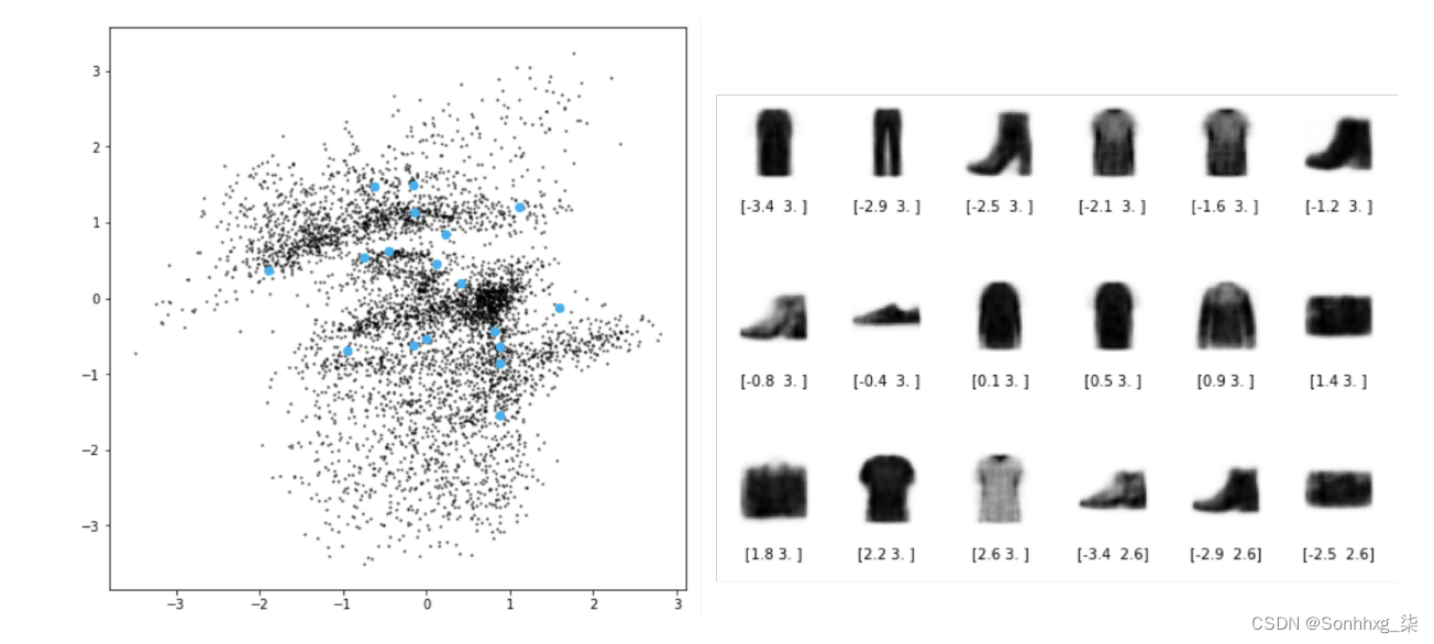 参考回到图2.10 ,我们可以看到潜在空间的组织方式发生了一些变化。黑点显示z_mean每个编码图像的值。KL 散度损失项确保 和z_mean值z_log_var永远不会偏离标准正态太远。因此,我们可以从标准正态分布中采样以在要解码的空间中生成新点(蓝点)。