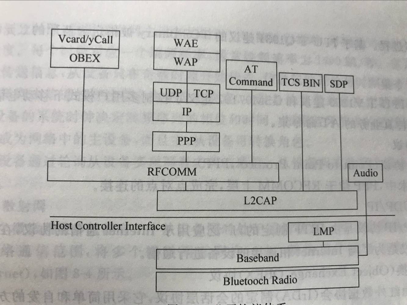 蓝牙的协议体系分为核心协议、电缆替代协议、电话传送控制协议和可选协议四层。除了上述协议层外,规范还定义了主机控制器接口(HCI),它为基带控制器、连接管理器、硬件状态和控制寄存器提供命令接口。