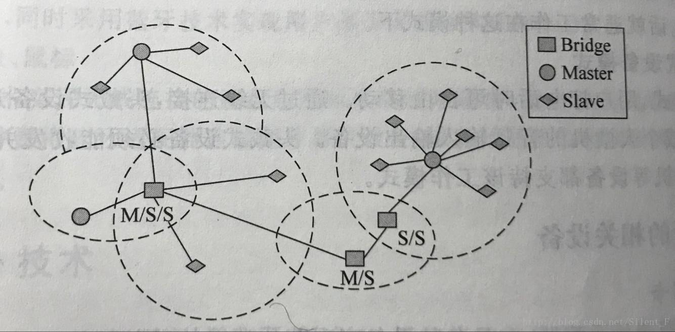 一个微微网最多能有7个从设备同时处于通信状态。为了能容纳更多的装置,并且扩大网络通信范围,将多个微微网互联在一起,就构成了蓝牙自组织网,即散射网,如图