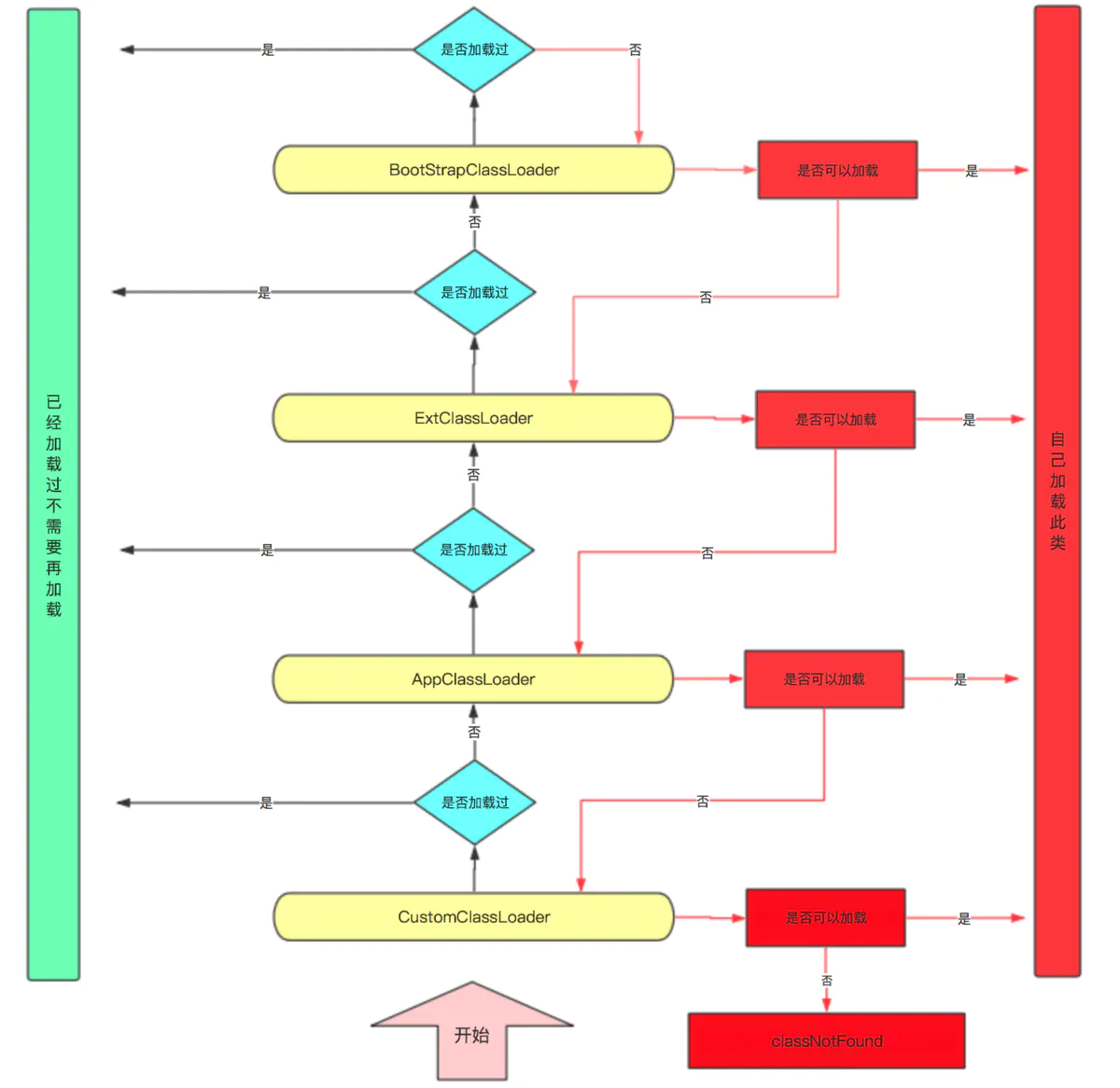 上图中的CustomClassLoader是自定义类加载器, 可以作为打破双亲委派机制的的一种方式, 原理就是我们自己编写自定义类加载器, 在该类加载器中加载特定的.class文件, 那么就不会再继续委托给上级类加载器了