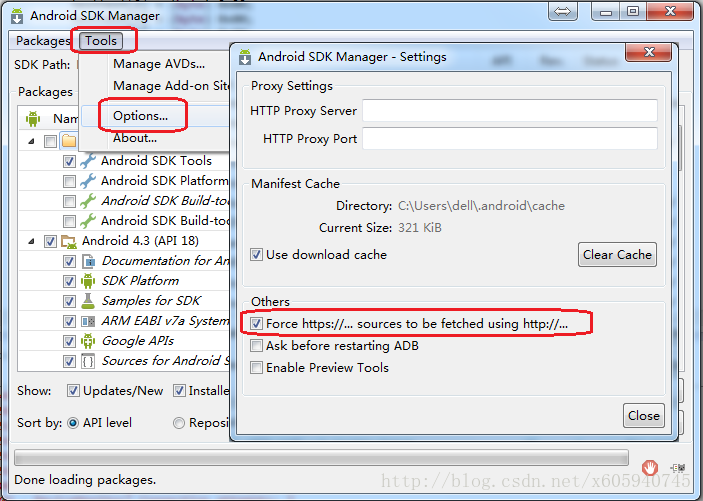 修改方法是:如下图,在Android SDK Manager->Tools-Options...选项界面,