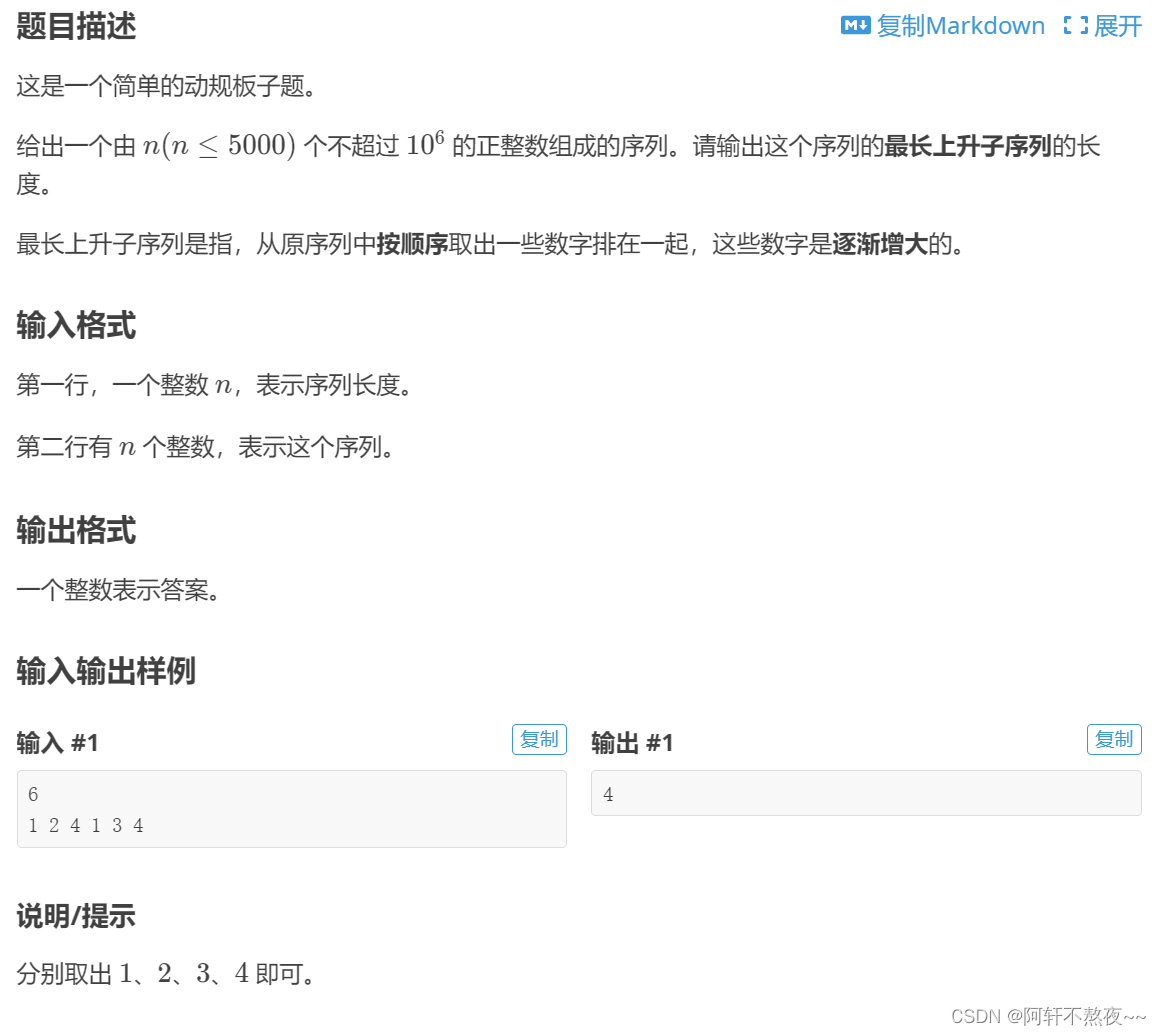 这一题就相当于最长上升子序列的模版题,通过动态规划(朴素法)就可以解决,这里可以当做模版学习。