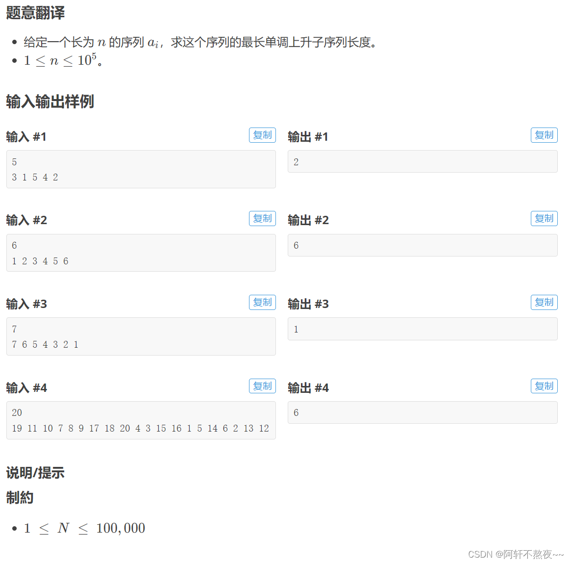 1.最长上升子序列(Longest Increasing Subsequence),简称LIS,也有些情况求的是最长非降序子序列,二者区别就是序列中是否可以有相等的数。假设我们有一个序列 b i,当b1 < b2 < … < bS的时候,我们称这个序列是上升的。