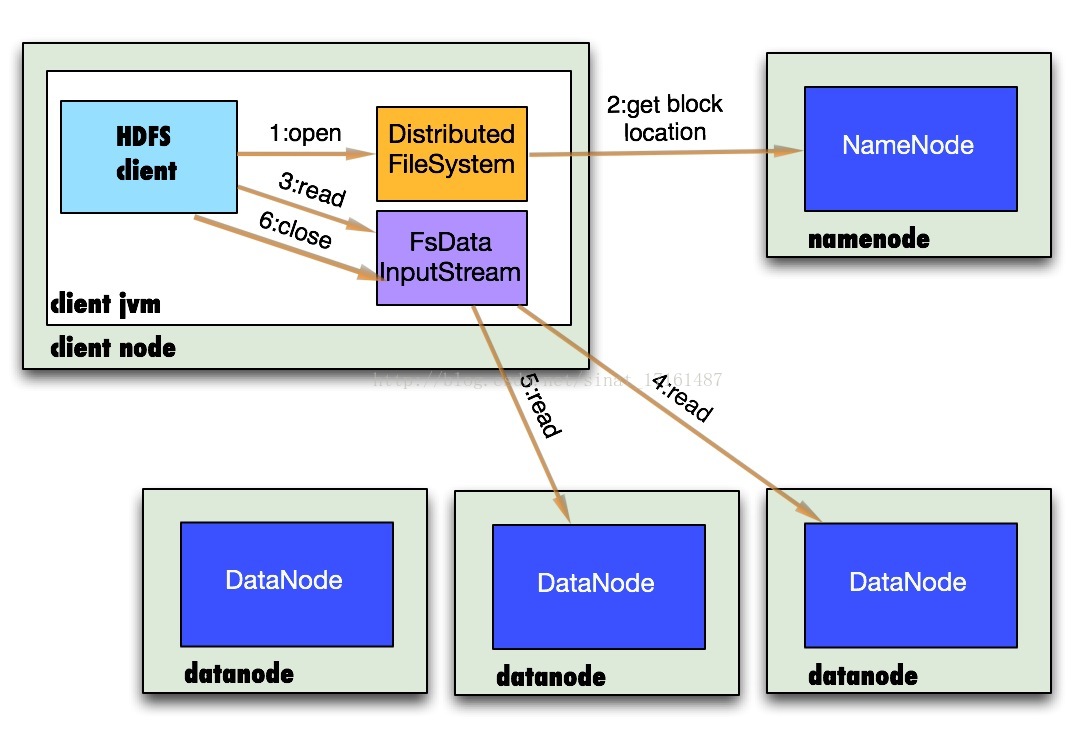 一个HDFS集群由一个NameNode和若干个DataNode组成,Namenode是主服务器,管理文件系统的命名空间和客户端对文件系统的访问操作;集群中的datanode管理存储的数据。其读数据如图: