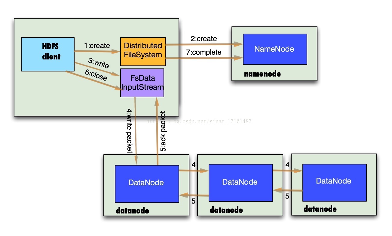 4.DataStreamer会去处理接受data quene,他先问询namenode这个新的block最适合存储的在哪几个datanode里,比如重复数是3,那么就找到3个最适合的datanode,把他们排成一个pipeline.DataStreamer把packet按队列输出到管道的第一个datanode中,第一个datanode又把packet输出到第二个datanode中,以此类推(流式写入,给datanode1的packet1刚传完,datanode1就会把这packet1传给datanode2,)。