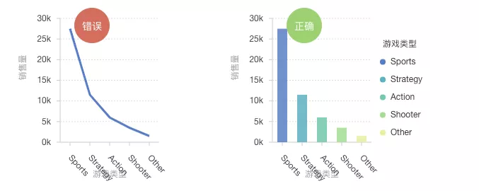 例子 2:我们以一个不同游戏类型的销量对比的场景为例,对于表示分类对比的数据时,我们更应该使用柱状图,而不是折线图。