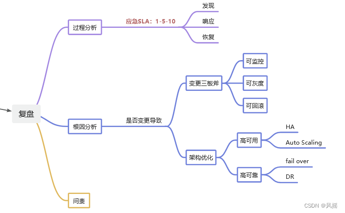 过程分析即发现、响应和恢复的过程中具体指标是多少,比如阿里提出的1-5-10指标:1分钟发现、5分钟响应、10分钟恢复。在复盘中问自己三个问题:发现阶段有没有监控覆盖?响应阶段有没有高效执行?恢复阶段有没有应急预案?