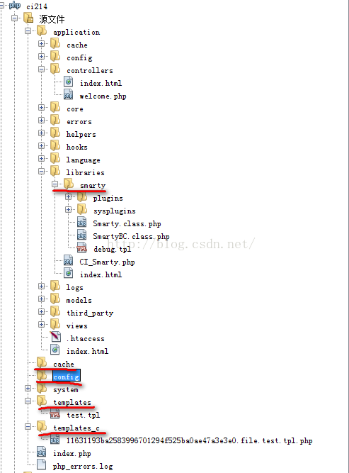 1.将smarty拷贝到application/libraries下,然后再根目录下下新建templates,templates_c,config,cache目录,结构如下: