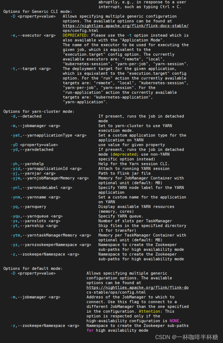 先说结论:对于三种Cli,Generic CLI mode、yarn-cluster mode、default mode,无法同时使用,源码使用顺序为Generic CLI mode优先判断,接着是 yarn-cluster mode ,最后是default mode,所以对于三种Cli的参数,不能混用,否则会出现命令不生效的情况,具体使用以及源码见下文