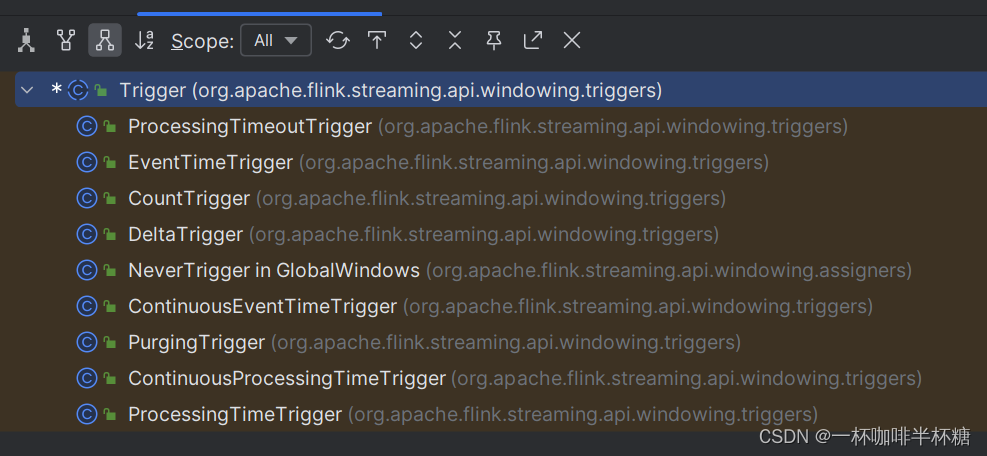 如果不设置trigger()方法则 WindowAssigner 会根据不通类型默认使用一个 Trigger,例如所有的 event-time WindowAssigner 都默认使用 EventTimeTrigger。 这个 trigger 会在 watermark 越过窗口结束时间后直接触发,一共有以下几种trigger