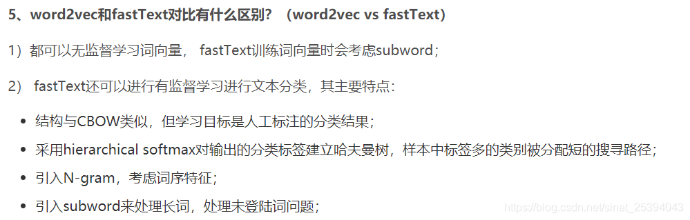 word2vec、fastText:优化效率高,但是基于局部语料;glove:基于全局预料,结合了LSA和word2vec的优点;基于NNLM/RNNLM的词向量:词向量为副产物,存在效率不高等问题;矩阵分解(LSA):利用全局语料特征,但SVD求解计算复杂度大;elmo、GPT、bert:动态特征;