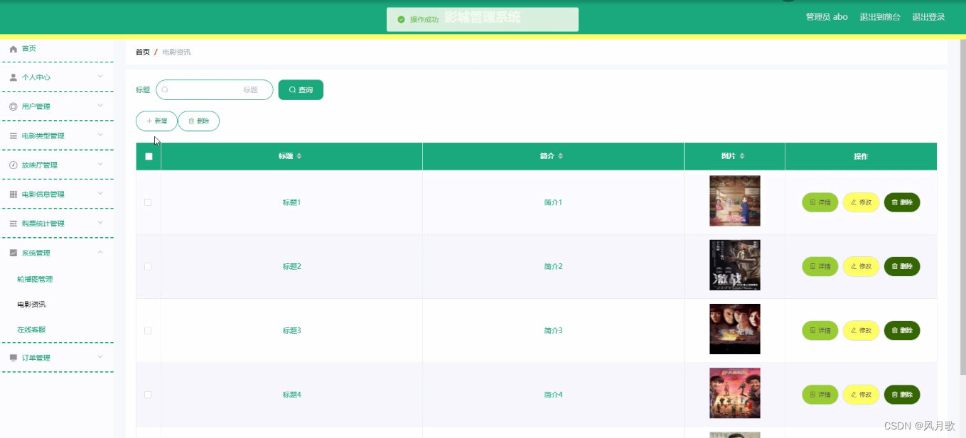 在电影资讯页面中可以查看标题、简介、图片等内容,并且根据需要对已有电影资讯进行详情,修改或删除等详细操作。