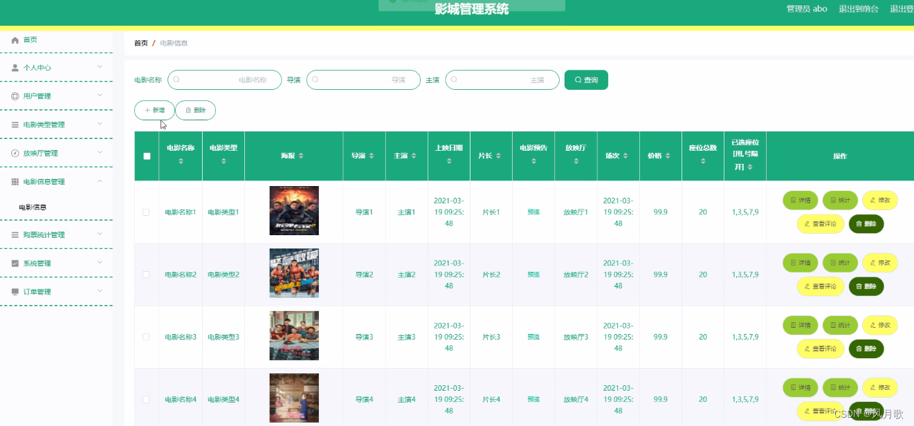 管理员登录进入影城管理系统可以查看首页、个人中心、用户管理、电影类型管理、放映厅管理、电影信息管理、购票统计管理、系统管理、订单管理等信息。