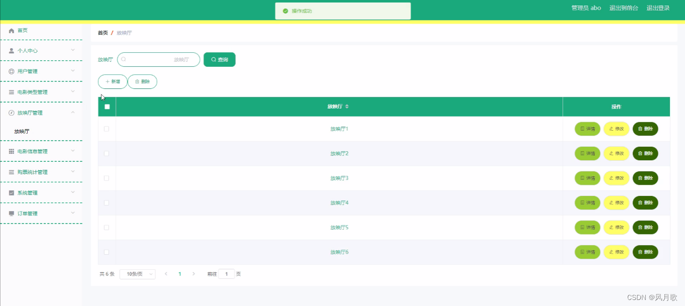 在放映厅管理页面中可以填写放映厅等信息,并可根据需要对已有放映厅管理进行修改或删除等操作。