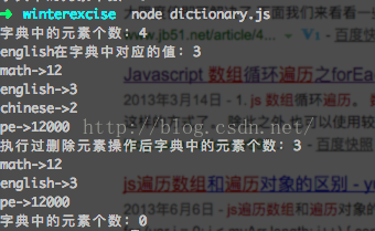 console.log("执行过删除元素操作后字典中的元素个数:" + books.count());