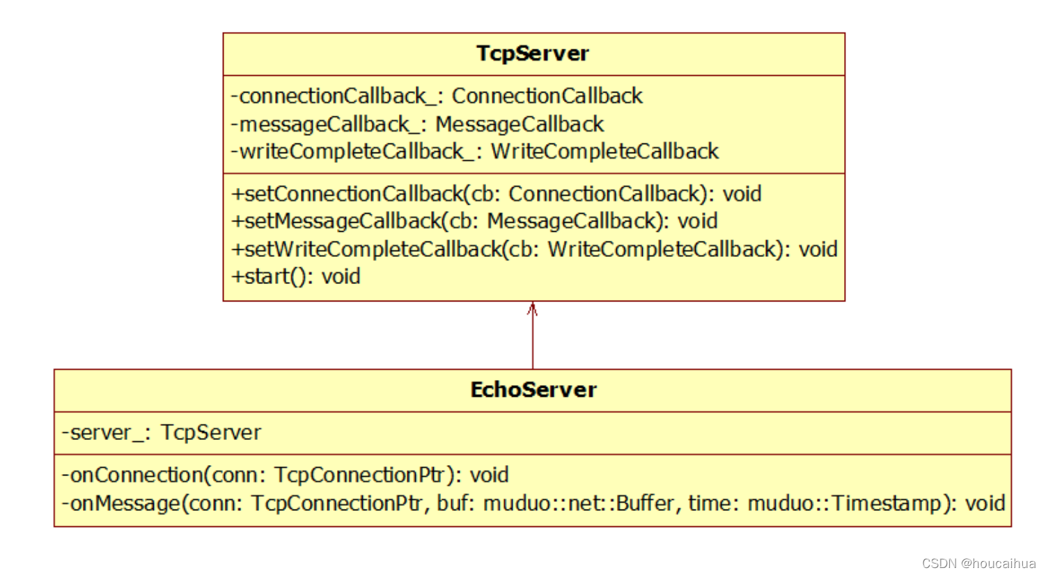 通过TcpServer 提供了三个成员函数来注册三个回调函数,连接成功和断开用了一个回调函数。