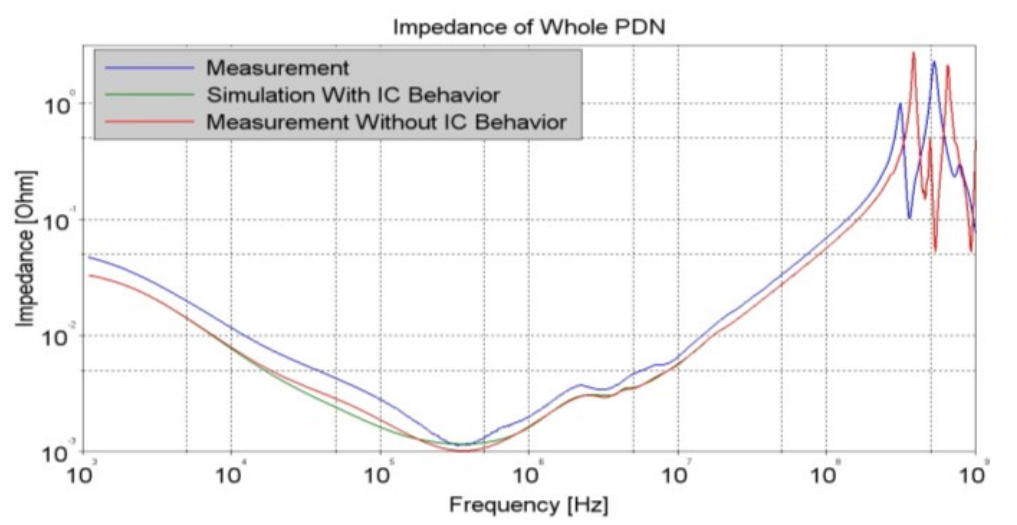 最后,通过将包括IC行为的方法与测试载体的整个PDN的测量结果进行比较来验证该方法,当然也将其与缺少IC信息的经典仿真进行比较。比较结果呈现在图9中。首先可以评论的是,这两种仿真都代表了整个PDN的行为。然而,可以看出,包括IC寄生效应(特别是其电容)的仿真比忽略它的方法给出了更好的结果。