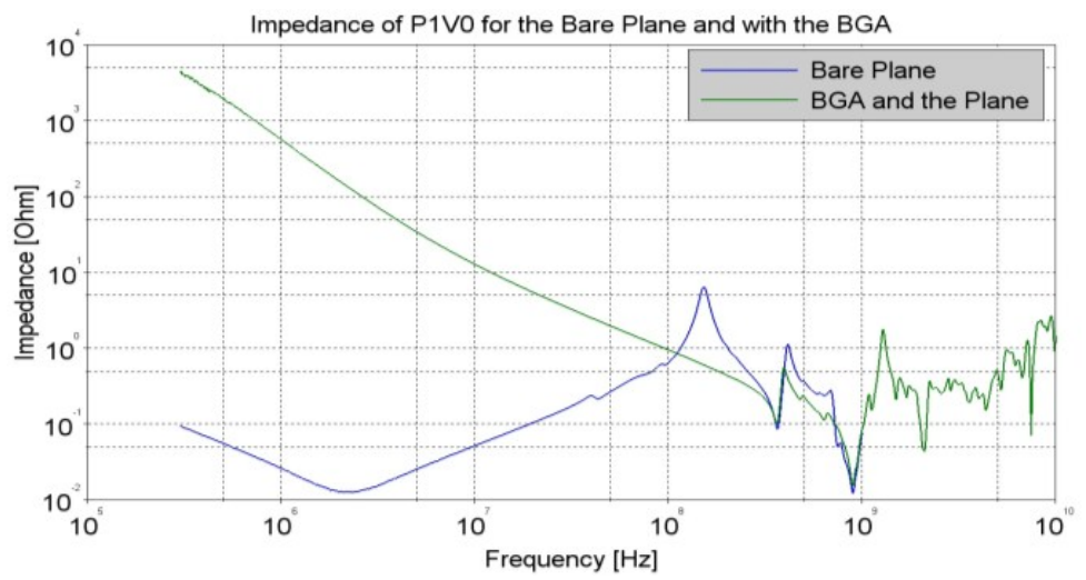 上面测试中获得的结果并不代表BGA焊接到PCB上后的确切阻抗。实际上,在实际应用中,当VCCINT网络通过16个引脚连接到平面时,仅在2对引脚上测量了VCCINT网络的阻抗。由于更多引脚的连接是并联放置的,因此允许降低封装的电阻和电感寄生效应。由于BGA组件和PCB之间关联的测量将考虑连接到所研究网络的所有引脚,因此执行了特殊的安装,以使整个系统的测量类似于仅对组件的测量。仅将VCCINT和GND网络的2个引脚焊接到PCB上,而保留连接到其他网络的额外焊球,以便将组件正确焊接到PCB上。