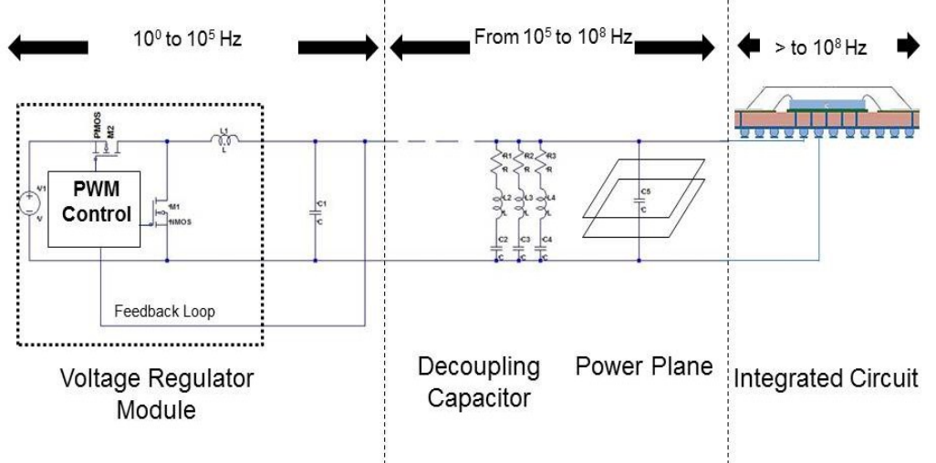 PDN的作用是在不同工作阶段为组件提供足够的电流电荷。必须在狭窄的电压电平容差范围内管理高电流变化。这些变化与从直流到最快电流瞬变的整个频率范围内的电源传输网络(PDN)阻抗有关。如图1所示,PDN包括电压调节模块,该模块主要是DC-DC转换器或低压差稳压器(LDO),是从直流到数百千赫兹的主要电流源。电源平面和连接的固有寄生电感往往会使PDN的阻抗随频率成比例增加。因此,使用去耦电容来保持阻抗低于目标阻抗。它们的效果从数百千赫兹到数百兆赫兹有效。最后,电源平面是PCB设计师可以用来满足目标阻抗要求的最后一个元素。