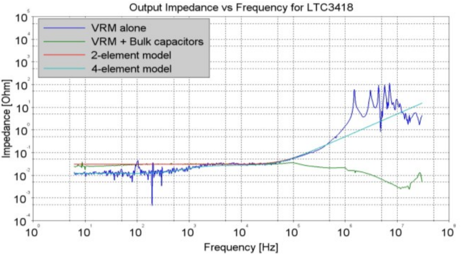 VRM的输出阻抗是通过实现Linear Technology的DC-DC转换器LTC3418的专用PCB来测量的。在不同的静态负载条件下测量输出阻抗。在图6中可以观察到,直到50 KHz,测量与二元件或四元件模型之间有很好的相关性。值得一提的是,模型不随负载条件而变化。