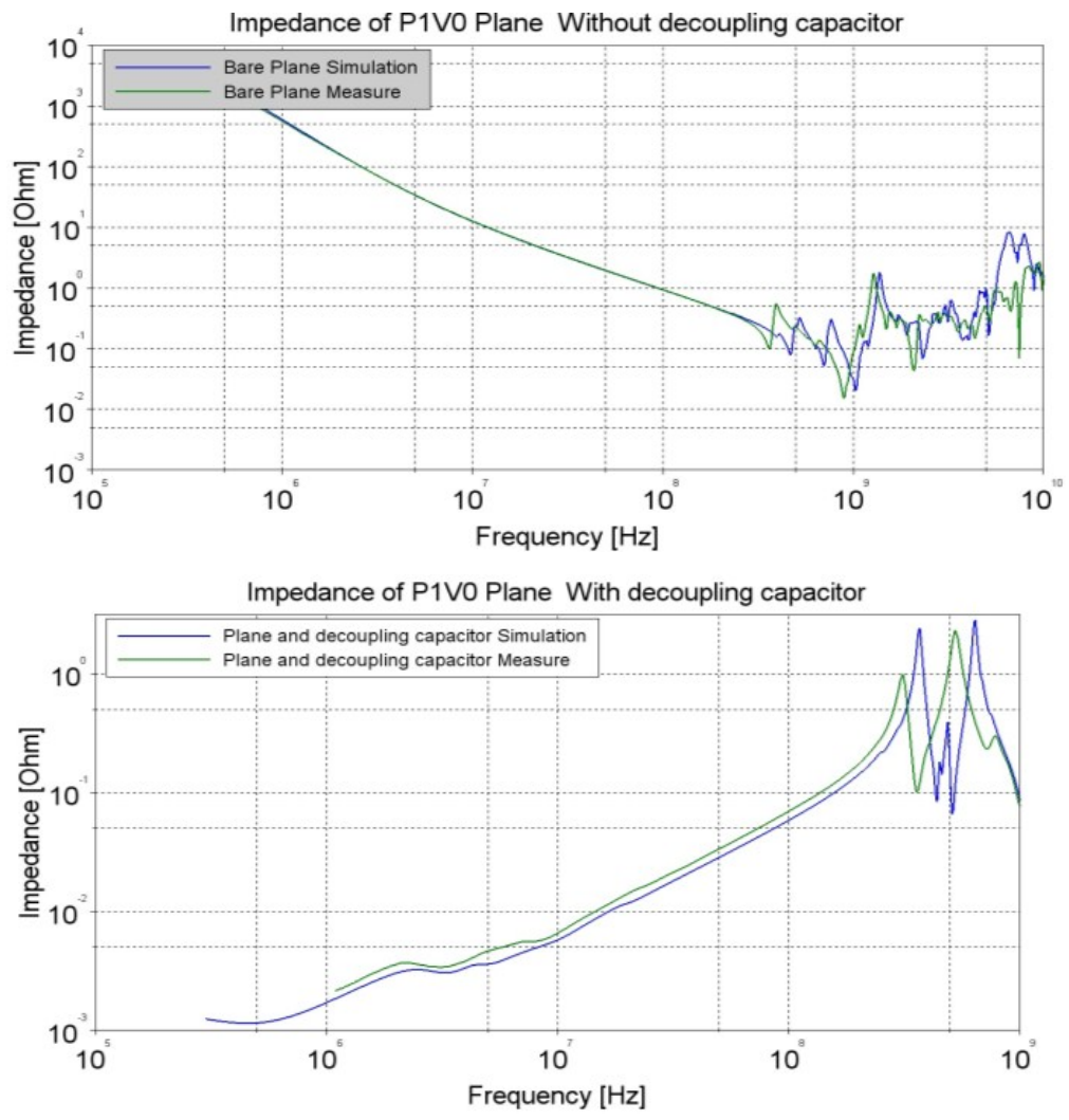 电源平面的复杂形状通过2.5D混合电磁求解器中的S参数仿真来建模。此外,可以在求解器中将电容模型附加到平面上,以查看它们的效果。电容可以通过等效RLC串联电路或通过输入制造商提供的S参数模型来建模。从仿真获得的S参数文件然后使用脚本转换为Z参数文件。