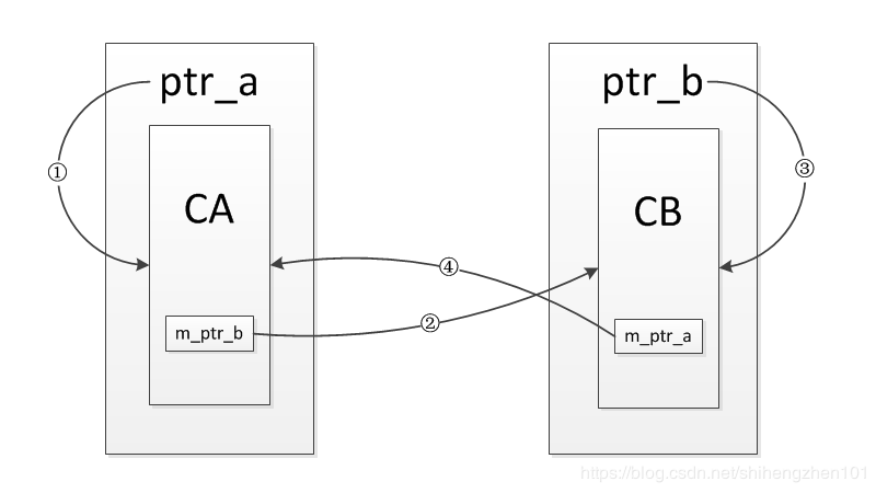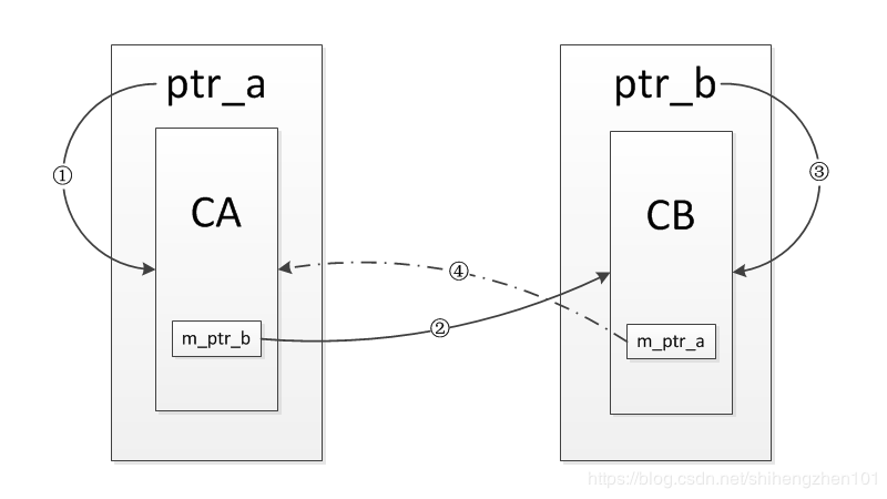 通过结果可以看到,最后CA和CB的对象并没有被析构,其中的引用效果如下图所示,起初定义完ptr_a和ptr_b时,只有①③两条引用,然后调用函数set_ptr后又增加了②④两条引用,当test_refer_to_each_other这个函数返回时,对象ptr_a和ptr_b被销毁,也就是①③两条引用会被断开,但是②④两条引用依然存在,每一个的引用计数都不为0,结果就导致其指向的内部对象无法析构,造成内存泄漏。