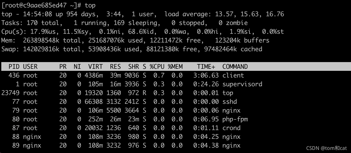 (1)top - 14:54:08 up 954 days, 3:44, 1 user, load average: 13.57, 15.63, 16.76