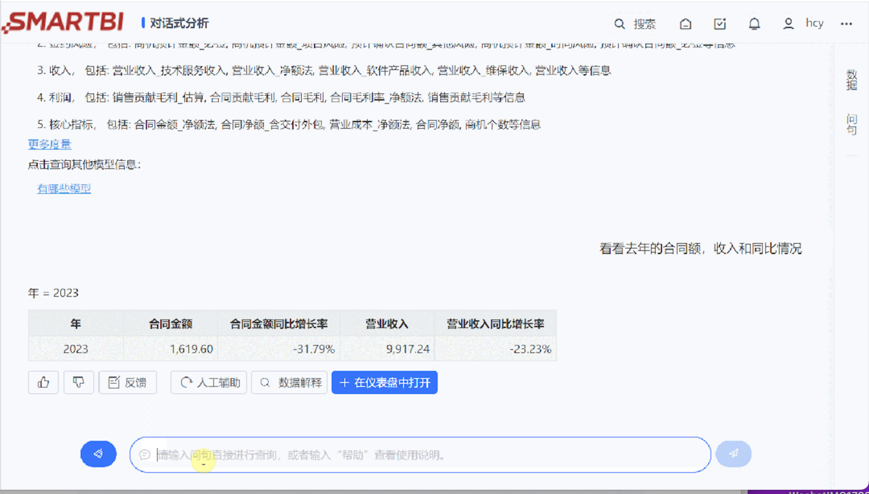 在应用过程,我们就能看到,基于充分的指标理解,Smartbi对话式分析大模型版本能迅速的调取用户想要获取的“关于公司去年的合同额、收入和同比情况”。