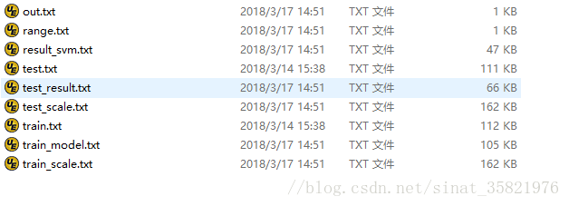 上图是SVM分类后的文件,其中的train.txt中包括了样本的标签和特征(train_scale.txt是归一化的文件),result_svm.txt文件就是分类后的文件,我们来看一下