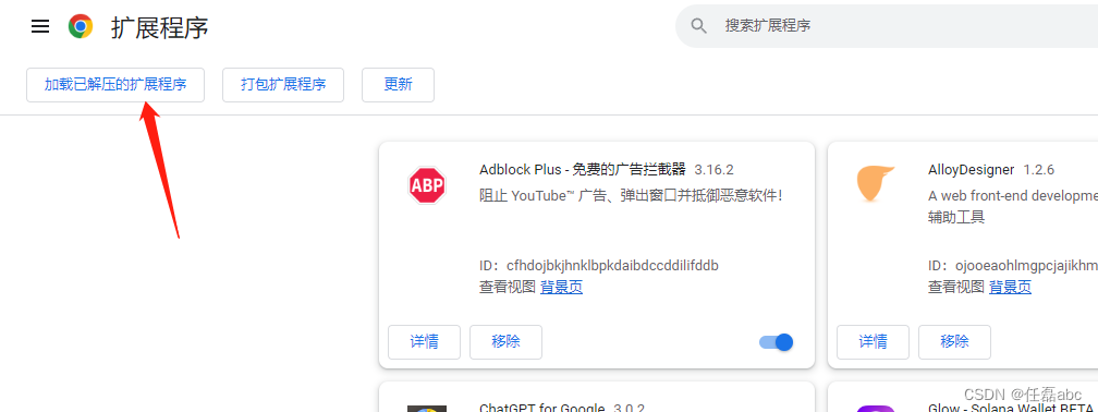 完成以上配置后,使用pnpm dev启动本地开发,本地开发完成后,使用打包命令:pnpm build,打包出dist文件夹。打开谷歌扩展列表chrome://extensions/,或者在设置下面点击扩展程序进入。