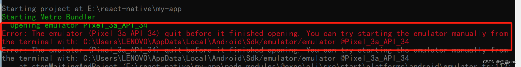 模拟器(Pixel_3a_API_34)在完成打开之前退出。您可以尝试使用以下命令从终端手动启动模拟器:C:\Users\LENOVO\AppData\Local\Android\Sdk/emulator/emulator@Pixel_3a_API_34