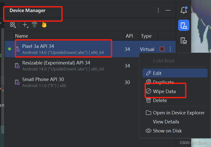我的解决办法是,打开 Android Studio编辑器,然后找到Device Manager下面的Pixel_3a_API_34,点击三个点点的,找到Wipe data 点击,wipe Data 的意思就是清除数据,具体操作如下:
