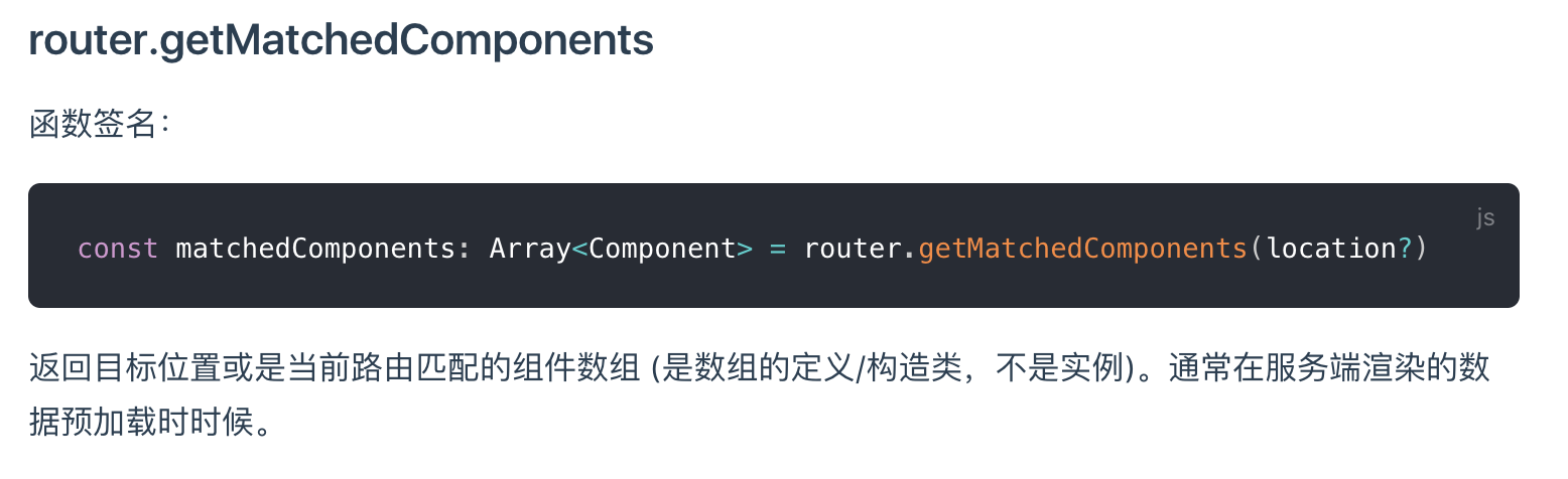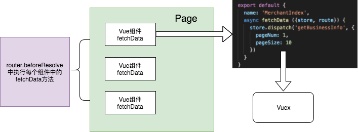 图意:每个页面(Page)中都会有很多个Vue组件,可以在Vue组件中添加自定义属性fetchData,fetchData里面可以执行异步请求(图中执行Vuex的Action),但是我们怎么获取到所有组件的fetchData方法并执行呢?如图所示,在router.beforeResolve守卫中,我们看看router.beforeResolve的定义,所有组件内守卫和异步路由组件被解析之后,解析守卫就被调用,意思是即使页面中有异步组件,它会等待异步组件解析之后执行,并且解析守卫在beforeEnter之前执行。那我们怎么在解析守卫中获取到待加载页面的所有组件呢?通过router.getMatchedComponents方法。