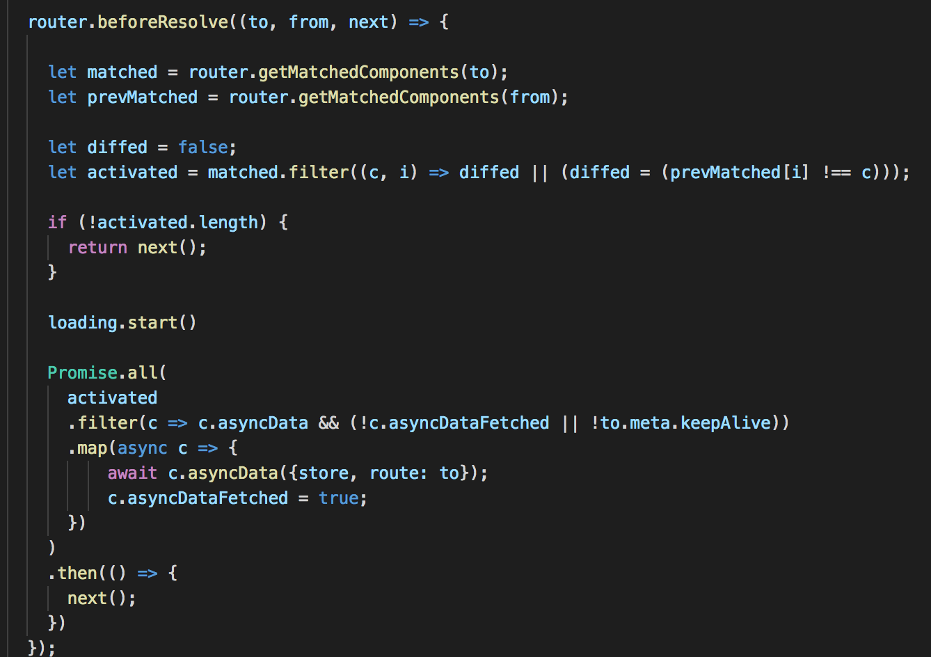 这样我们就可以在解析守卫中获取到所有待加载组件的fetchData方法并执行,这样无疑会在组件开始渲染之后获取到所有数据,提高页面加载速度。