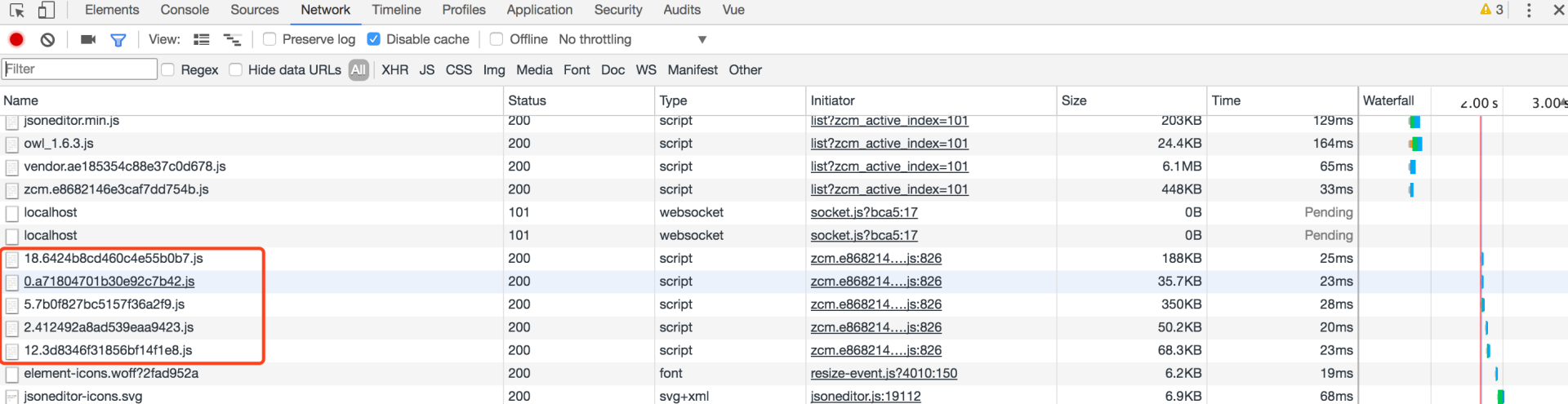 减小入口文件体积,常用的手段是路由懒加载,开启路由懒加载之后,待请求的页面会单独打包js文件,使得入口文件index.js变小,开启懒加载之后,js是这样请求加载的: