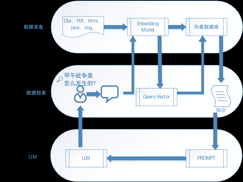 - 查询接口。通过这些接口用户可以先基于索引进行检索,再将检索结果和之前的输入 Prompt 进行组合形成新的扩充 Prompt,对话大模型并拿到结果进行解析。
