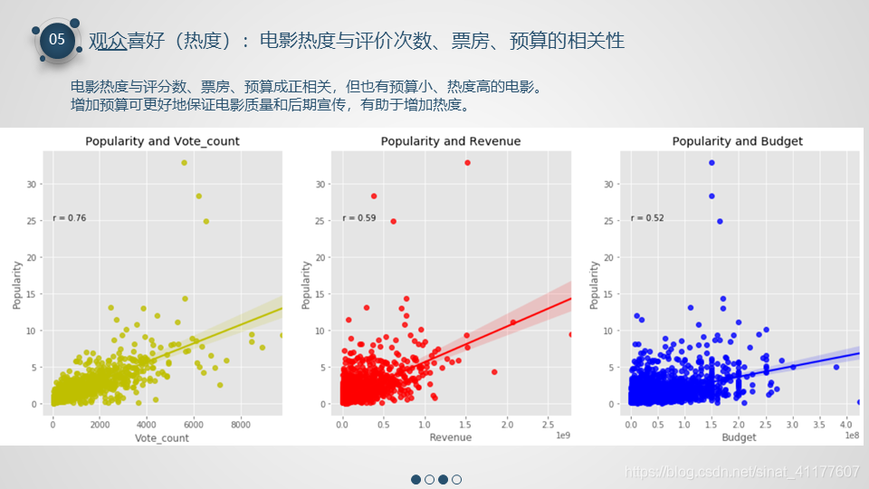 绘制电影热度与评价次数、票房、预算的相关性散点图及其线性回归线