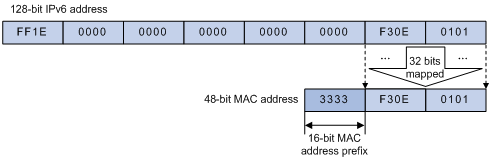 IANA规定,IPv6组播MAC地址的高16位为0x3333,低32位为IPv6组播地址的低32位。如图1-7所示,是IPv6组播地址FF1E::F30E:101的MAC地址映射举例。从图中可见,由于IPv6组播地址中只有低32位被映射到IPv6组播MAC地址,因此也存在与IPv4类似的地址重复映射问题。