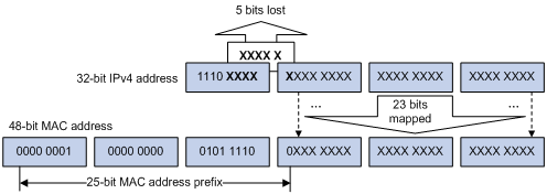 由于IPv4组播地址的高4位固定为1110,而低28位中只有23位被映射到IPv4组播MAC地址上,从而导致有5位信息丢失。于是,将有32个IPv4组播地址被重复映射到同一个IPv4组播MAC地址上,因此设备在进行二层处理时,可能会收到一些本不需要的组播数据,这些多余的组播数据就需要上层进行过滤了。