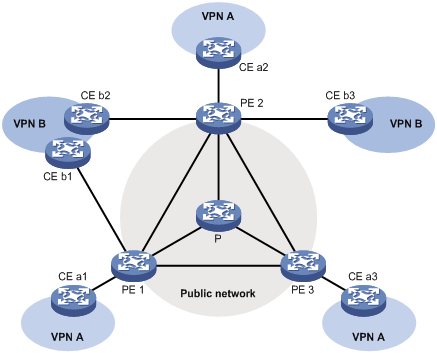 各VPN网络之间、VPN网络与公共网络之间要求信息隔离。如图1-10所示,VPN A和VPN B通过PE设备接入公共网络。