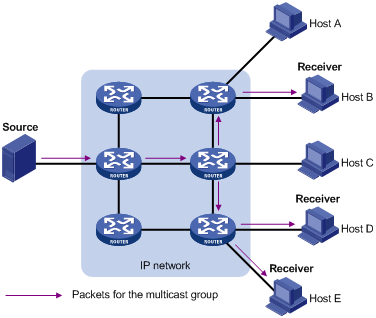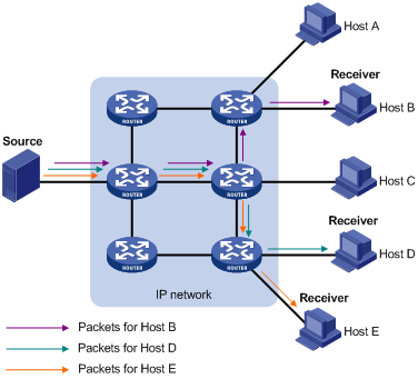 假设只有Host B、Host D和Host E需要信息,采用组播方式时,可以让这些主机加入同一个组播组(Multicast group),组播源向该组播组只需发送一份信息,并由网络中各路由器根据该组播组中各成员的分布情况对该信息进行复制和转发,最后该信息会准确地发送给Host B、Host D和Host E。