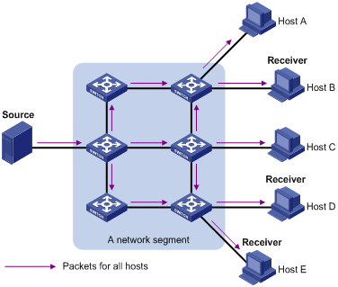 假设只有Host B、Host D和Host E需要信息,若将该信息在网段中进行广播,则原本不需要信息的Host A和Host C也将收到该信息,这样不仅信息的安全性得不到保障,而且会造成同一网段中信息的泛滥。